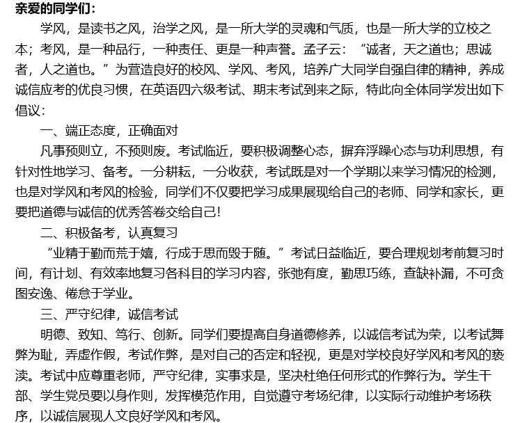在英语四六级考试、期末考试到来之际,人文学院在学校主页发布《诚信文明考试倡议书》,倡导全校学生端正态度,正确应对;积极备考,认真复习;严守纪律,诚信考试;脚踏实地,总结得失,并与全体学生一同共勉、互励、共进,诚信应考,杜绝作弊。