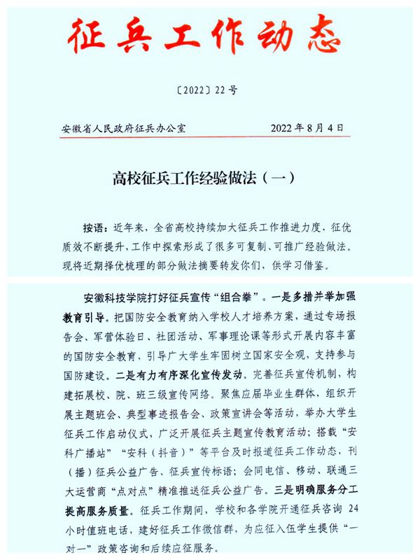 近日,由安徽省人民政府征兵办公室主办的《征兵工作动态》聚焦高校下半年征兵工作,择优刊发了部分院校征兵工作典型经验做法。我校扎实开展征兵宣传动员工作,成效显著,相关经验做法成功入选。