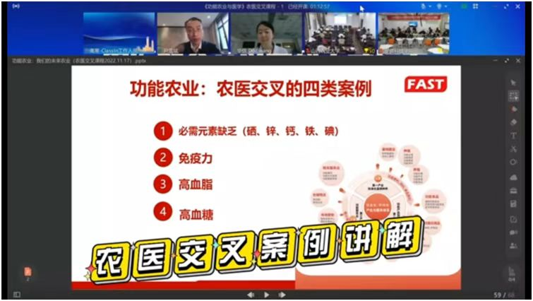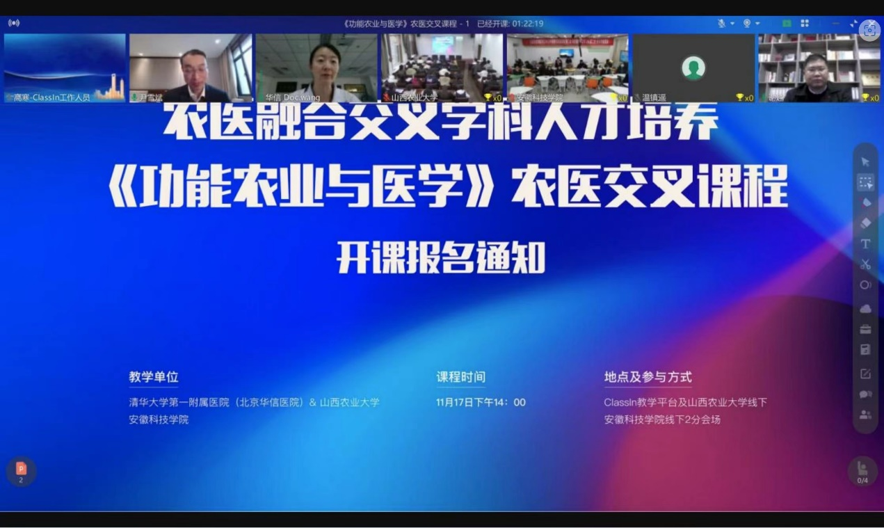 近日,我校与清华大学第一附属医院、山西农业大学合作举办了农医融合交叉学科人才培养课程首次授课。该课程由清华大学第一附属医院心血管内科副主任医师王晶、星空手机平台长三角功能农业(食品)研究院院长尹雪斌教授联合讲授。这也是《功能农业与医学》农医融合交叉第一课。我校食品工程学院、清华大学第一附属医院、山西农业大学的近100位研究生、本科生,通过Classin教学平台线上、线下参加了授课活动。