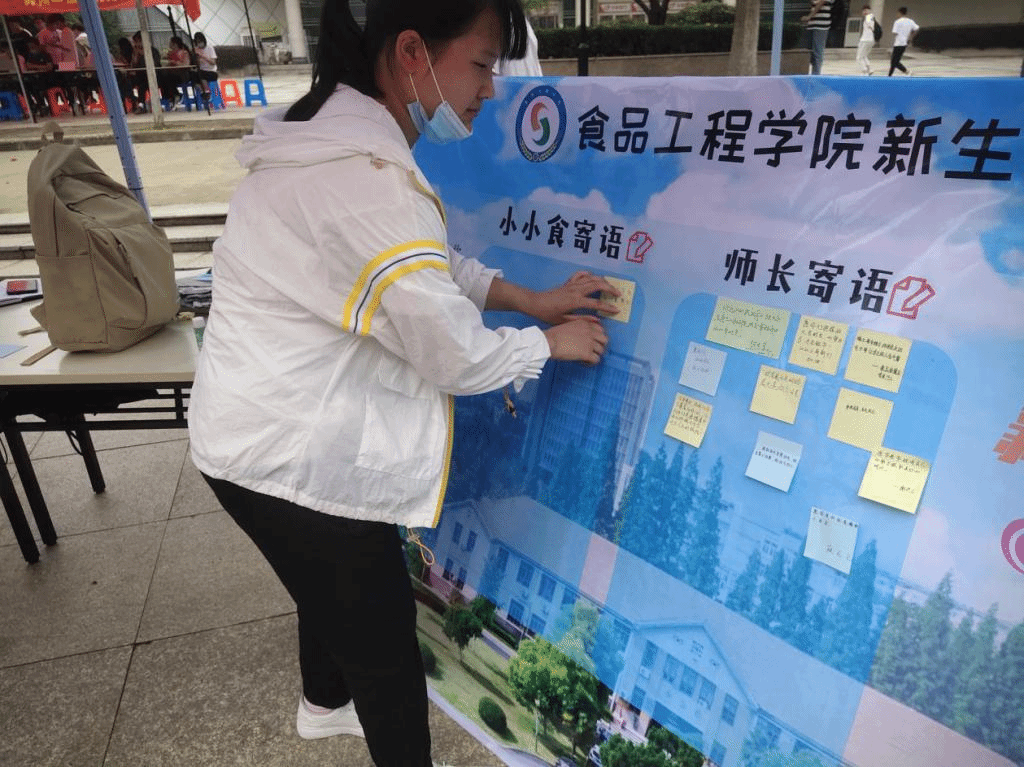 在师长与新生寄语墙上,“迈开坚定的步伐,走向既定的目标”、“明天是你们的世界,一切因你们而光辉”、祝愿你们在食品工程学院度过幸福成功的四年时光”......一句句微暖体贴的话,体现了学院老师和学长对新生的关怀和期望。“前程似锦,不负韶华”、“来日方长,一直努力下去”、“希望大学四年一直努力下去,不辜负自己,不辜负家人”......一句句朝气蓬勃的话,抒发了食品工程学院新生们对自己大学的期待与憧憬。
