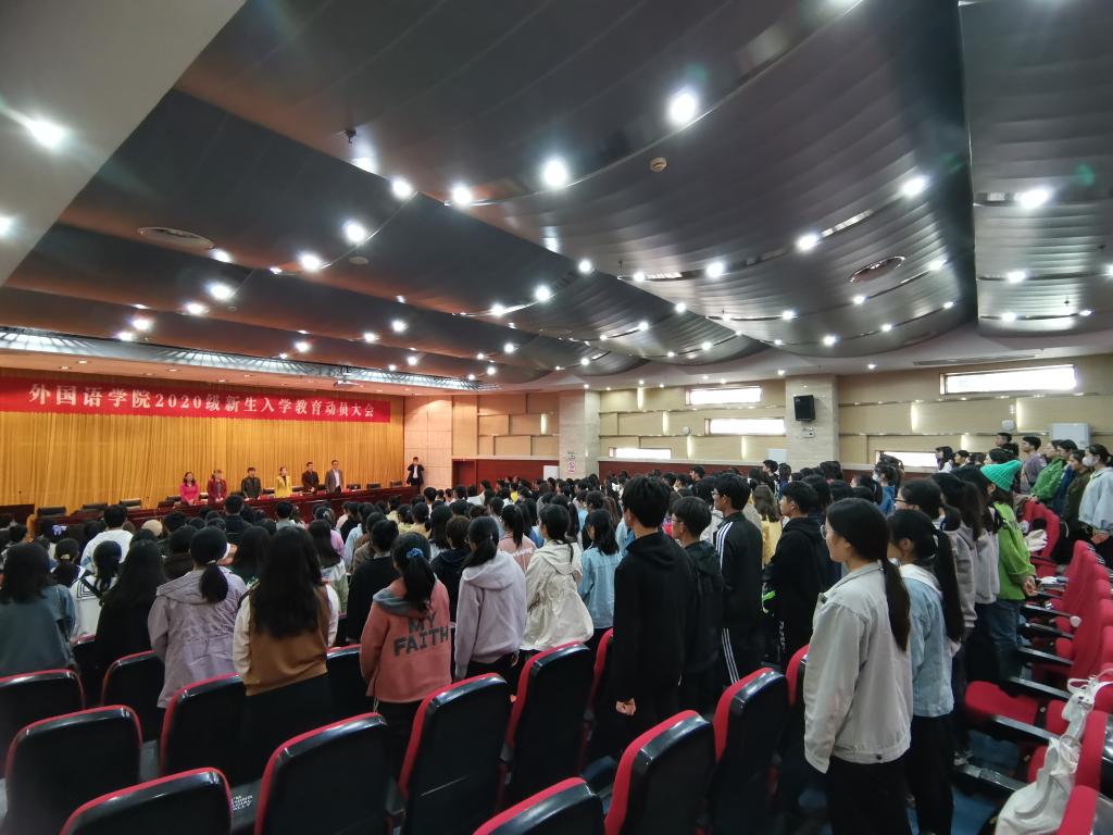 丹桂飘香,金秋送爽。20级新生带着青春的活力,带着对知识的不懈追求,带着对大学校园生活的无限憧憬,迈进了星空手机平台外国语学院。为了让新生更快适应新环境,适应新的生活,顺利、平稳、有效地进入大学生活。10月21日下午14:00,外国语学院在新图书馆第二报告厅举行了新生入学教育动员大会。外国语学院院长陈德用、党总支书记蔡为青、副院长刘萍、教学秘书周海平、英语专业教研室主任兼英语专业负责人洪民老师、翻译专业教研室主任兼翻译专业负责人邓兆红老师、分团委书记陈慧中、专职辅导员宋兵兵,学院教师代表,全体20级新生参会,大会由刘萍主持。