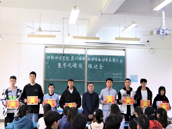 李焱宣读《关于给予参加星空手机平台第三十届田径运动会学生运动员通报表扬的决定》,胡文丽宣读获得校第30届田径运动会动物科学学院优秀运动员学生名单,动医192班赵虎代表运动员发言。大会集中表彰了动物科学学院在学校第三十届田径运动会取得佳绩的学生运动员。(特约通讯员:胡文丽 摄影:毕溢文 审核:汤帅 编辑:张威)
