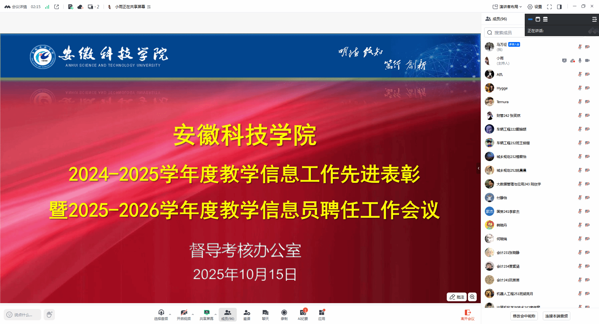 会上,督导考核办公室谢静静宣读了《关于表彰2024-2025学年度教学信息工作先进并聘任2025-2026学年度学生教学信息员的决定》,并带领全体参会人员共同学习了《星空手机平台学生教学信息员管理条例(修订)》。随后,她就教学信息员的工作内容开展了业务指导与培训。优秀教学信息员代表张瑞洁在会上作了经验分享。