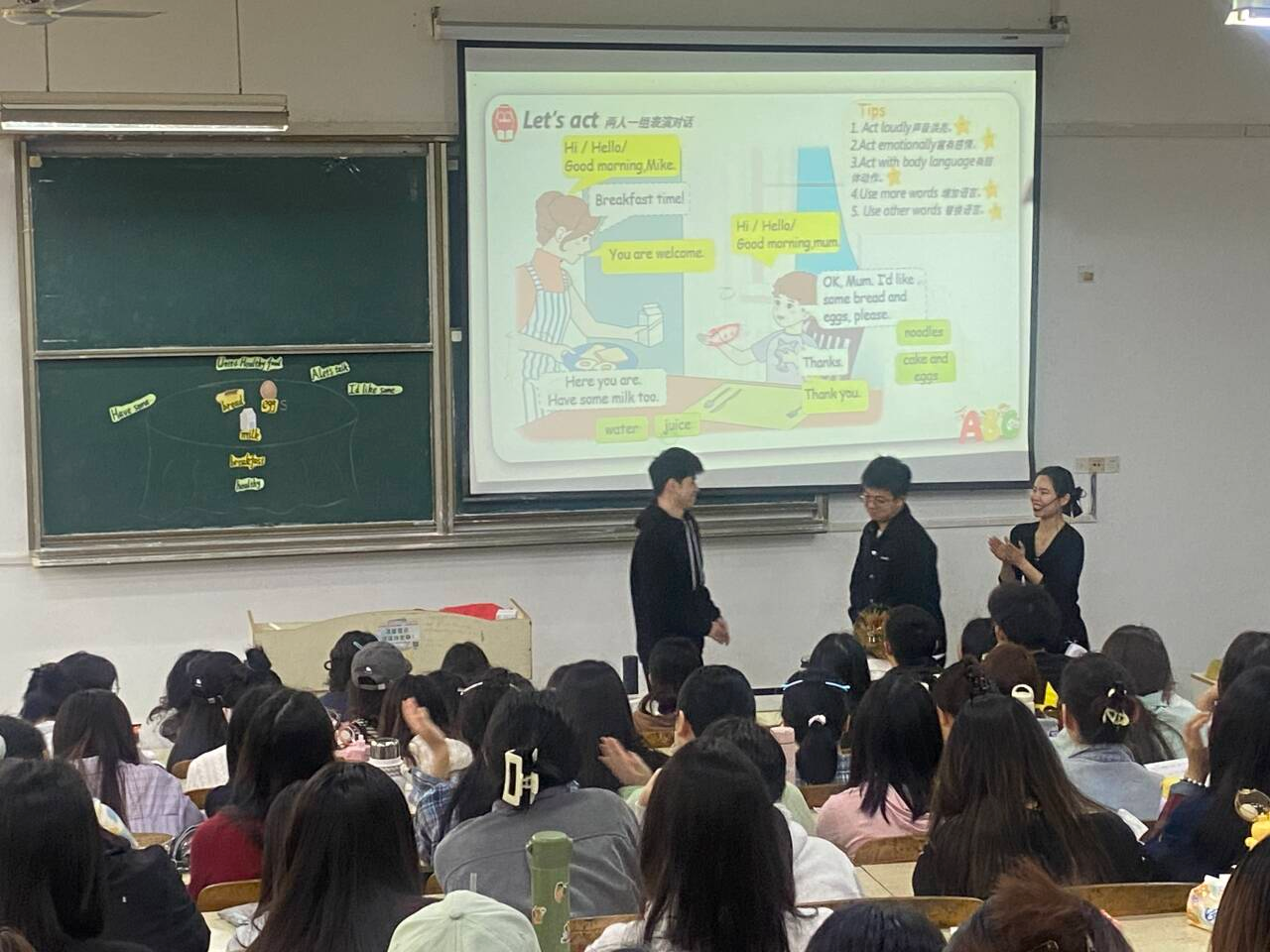 为积极深化课程教学改革,增强英语(师范)专业学生对中小学英语教学的深刻理解,4月10日上午,外国语学院特邀安徽省凤阳中学高级教师康立红老师以及凤阳县崇文小学一级教师、滁州市教坛新星戴世纯老师,在求知楼A103教室开展了英语教学讲座与示范教学活动。此次活动由外国语学院院长刘萍主持,部分任课教师共同出席,2022 级英语(师范)专业全体学生参与聆听与观摩。