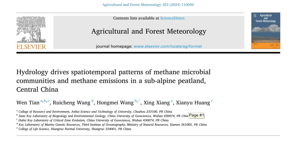 近日,我校资源与环境学院青年教师田文博士在农林科学领域的中科院一区Top期刊《Agricultural and Forest Meteorology》上发表了题为“Hydrology drives spatiotemporal patterns of methane microbial communities and methane emissions in a sub-alpine peatland, Central China”的文章。该研究通过长期的野外定位观测结合分子生物学手段揭示了水文驱动下亚热带地区亚高山泥炭地甲烷排放时空变化的微生物学驱动机制。