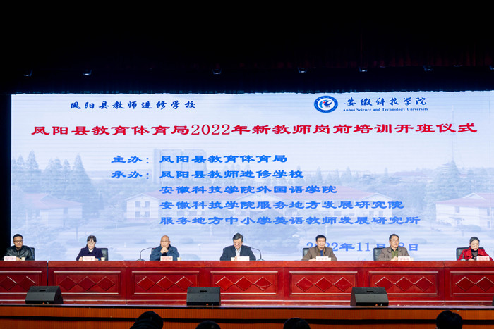 11月18日,我校首次“服务地方基础教育”专项培训班暨凤阳县教体局2022年新教师岗前培训班在大学生活动中心启动开班仪式。党委委员、副院长李升和出席开班式并致欢迎辞,凤阳县教体局副局长程节华和凤阳县教师进修学校校长陈元辉分别致辞。外国语学院院长刘萍介绍了培训班的筹备过程、学习内容、培训形式和工作安排。来自凤阳县中学、小学和幼儿园共150名新入职教师参加开班仪式。开班式由外国语学院党委书记蔡为青主持。